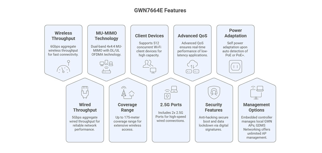The GWN7664E is a powerful, enterprise-grade 802.11ax Wi-Fi