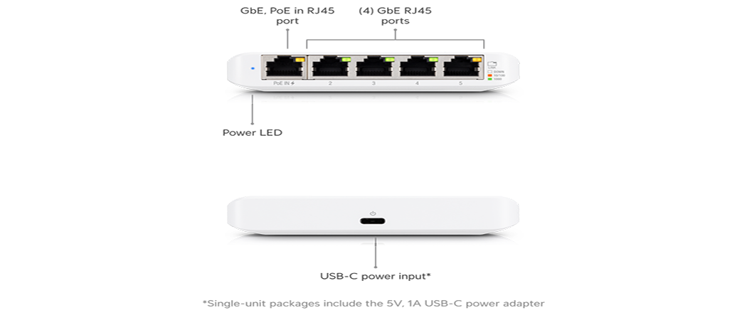 The Ubiquiti UniFi USW-Flex-Mini is an indoor, 5 Port managed Gigabit Ethernet Switch. It offers 5 x RJ45 Ethernet ports, providing 1 Gigabit link to your devices. Power up the USW-Flex-Mini with the included USB Type-C power adapter or with 802.3af PoE Ethernet in port 1.